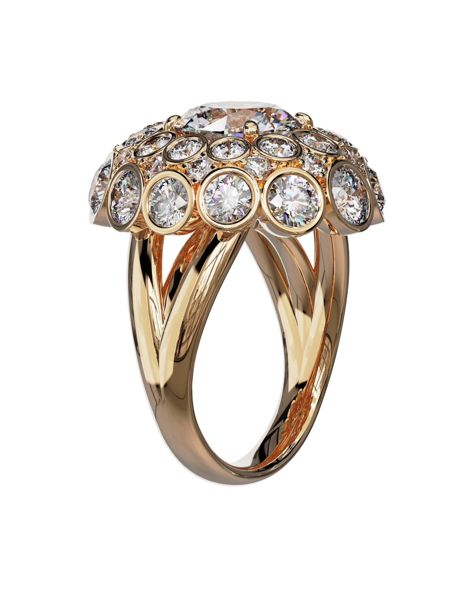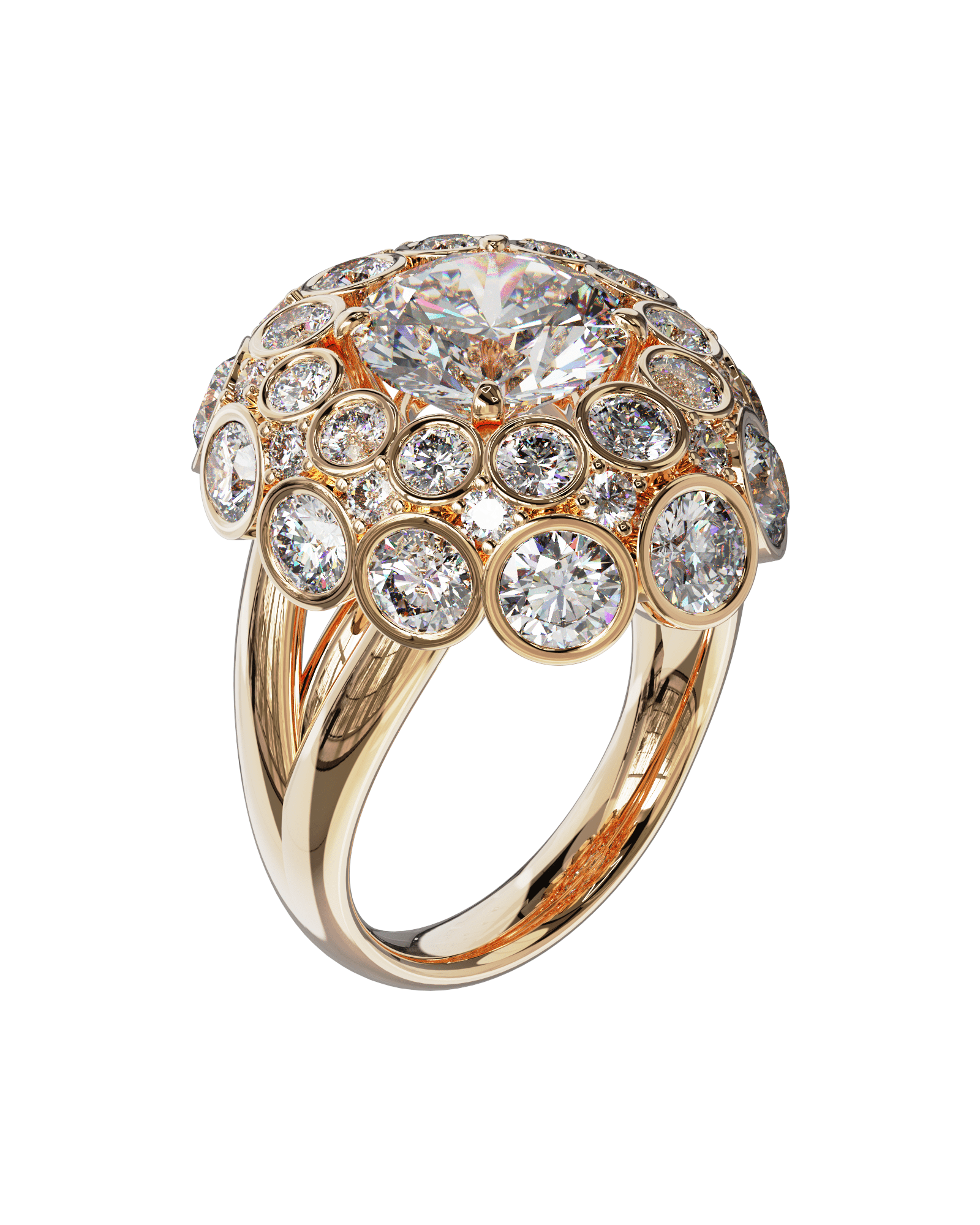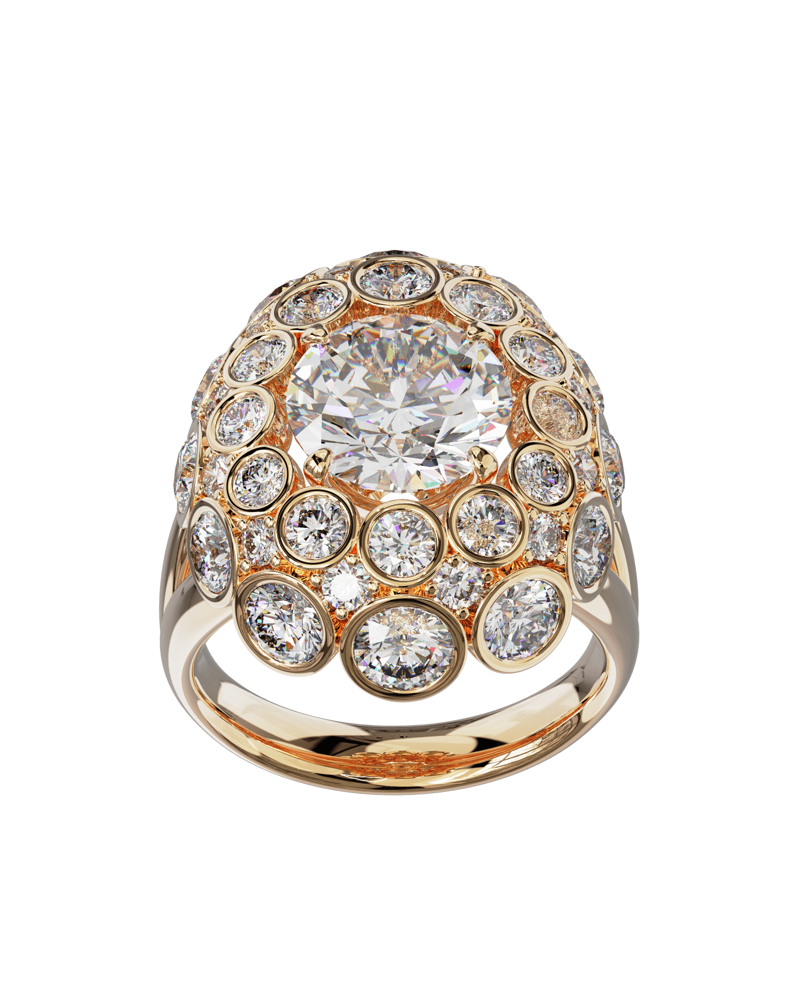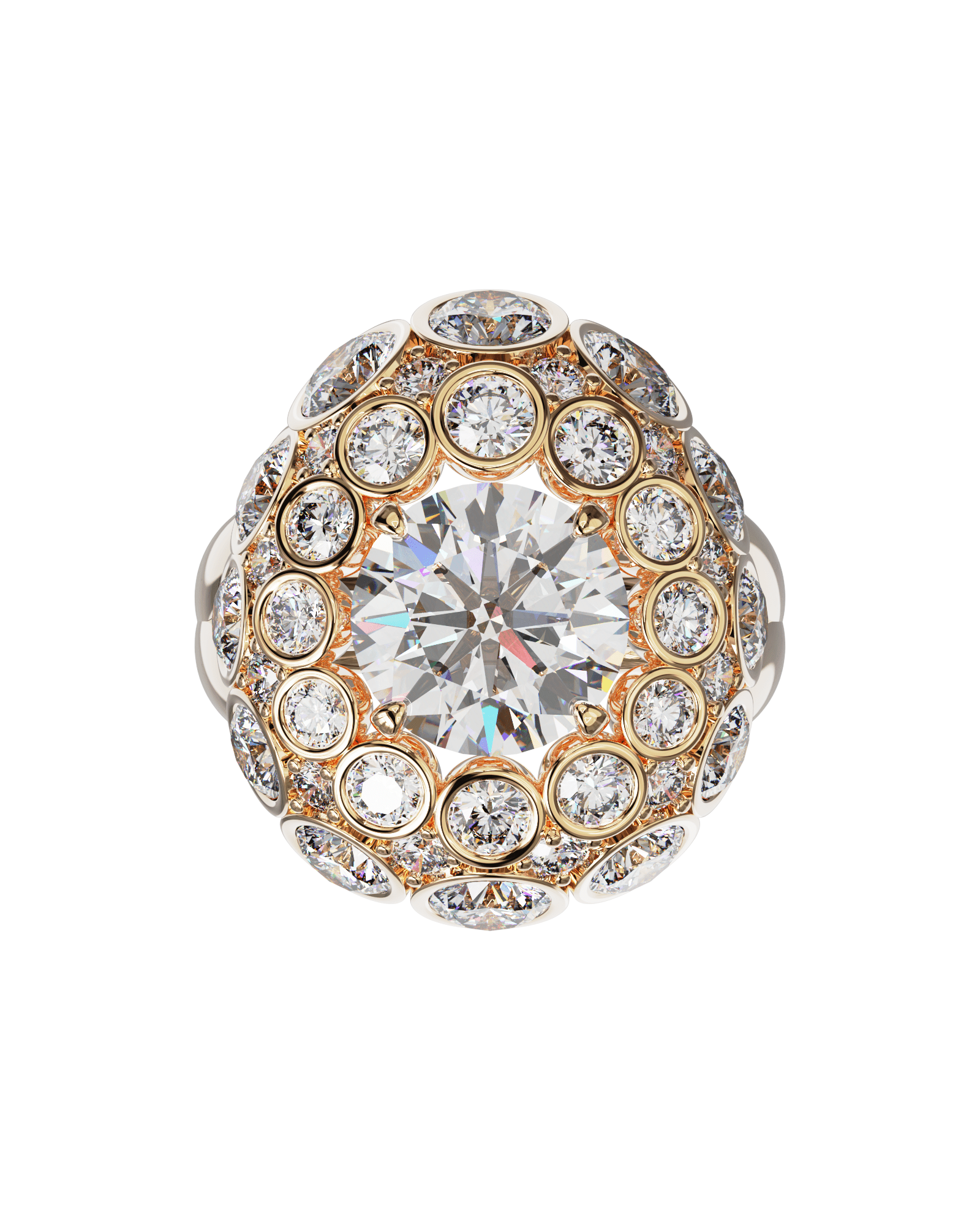 Spécifications : Or 750/1000 16.0gr, Diamant de synthèse Central Rond de 3.4Ct, D, VS+ de diamètre 9.77mm entouré de 12 diamants de synthèse Ronds de 0.30Ct et de 12 diamants de synthèse Ronds  de 0.08Ct et de 12 diamants de synthèse Ronds de 0.04Ct soit 8.44Ct total