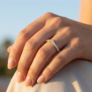 The CLASSIC ring, whether set with gemstones or crafted entirely from gold, was designed to harmonize naturally with the solitaire it accompanies, but also to be worn alone. Its gently curved profile follows the line of the finger, creating a soft, elegant, and fluid curve. Worn alone, it reveals the purity of its design: a thin gold thread with subtle contours that catches the light and accentuates the hand with simplicity and grace.