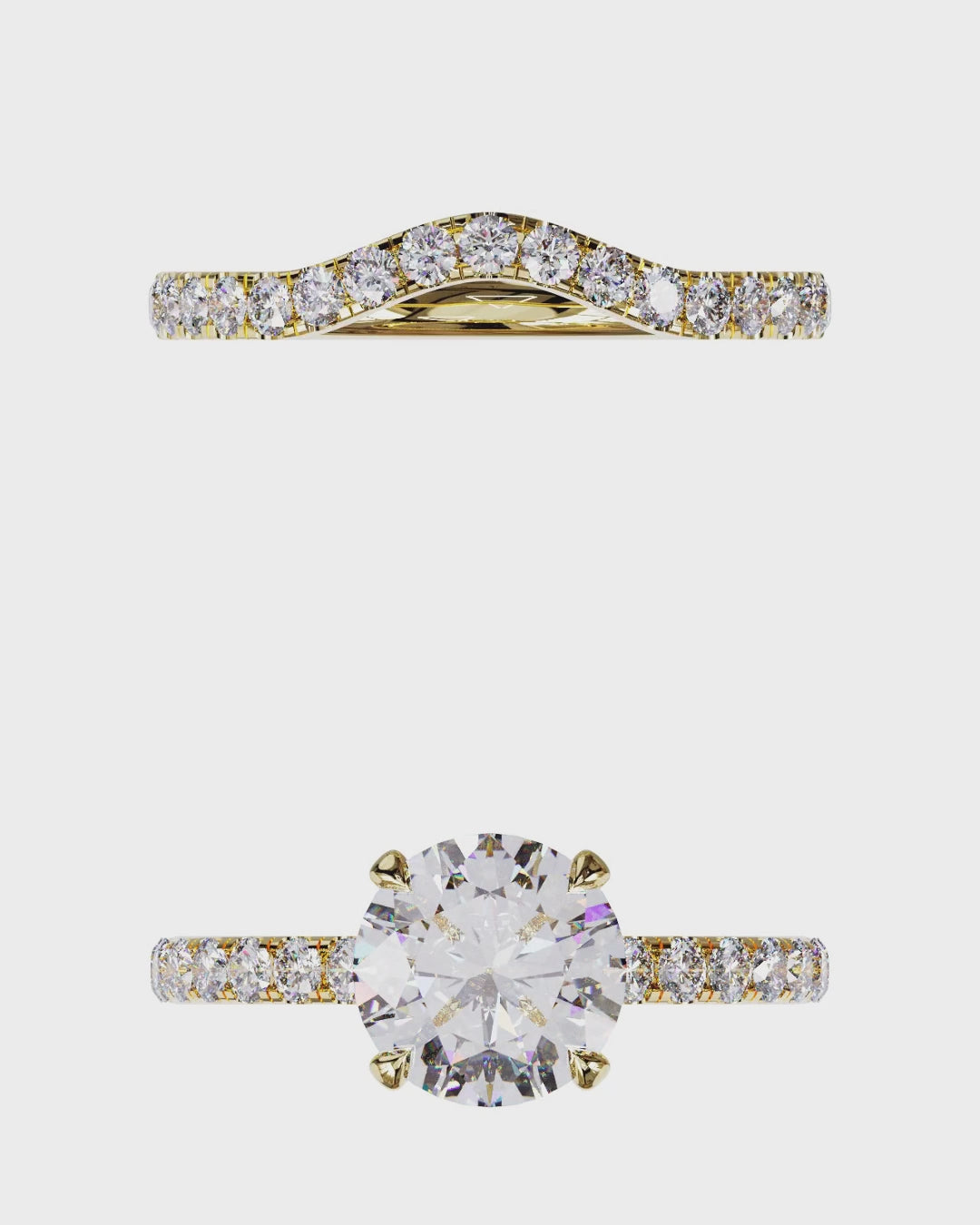 The central diamond catches the eye, while the pavé diamonds of the wedding band extend its brilliance, two different pieces, but conceived as one.