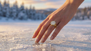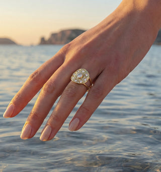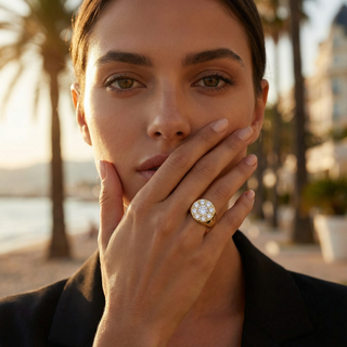 One carat at the center. Surrounding it, eight diamonds of 0.2 carats each. A reinvented halo, powerful, sculptural. Forged in solid gold, DAISY stands out as a sparkling, feminine, and powerful piece.