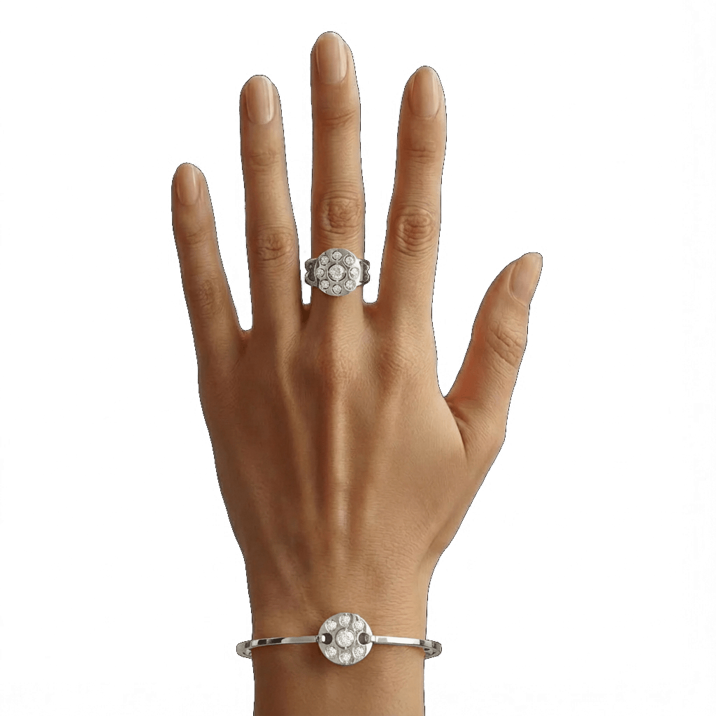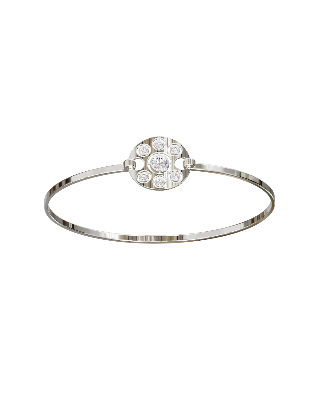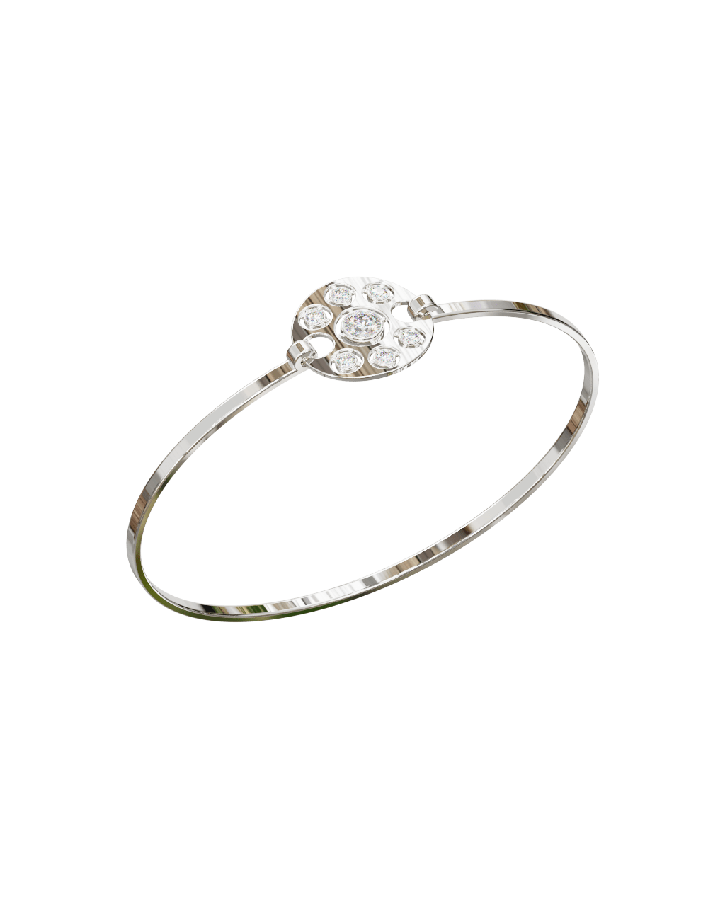 Specifications: 18k gold (750/1000) 6.0g, 0.22ct round synthetic diamond center, D, VS+, 3.90mm diameter, surrounded by 8 round synthetic diamonds totaling 0.030ct (0.46ct total).