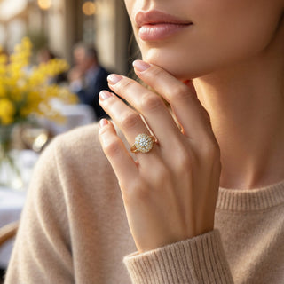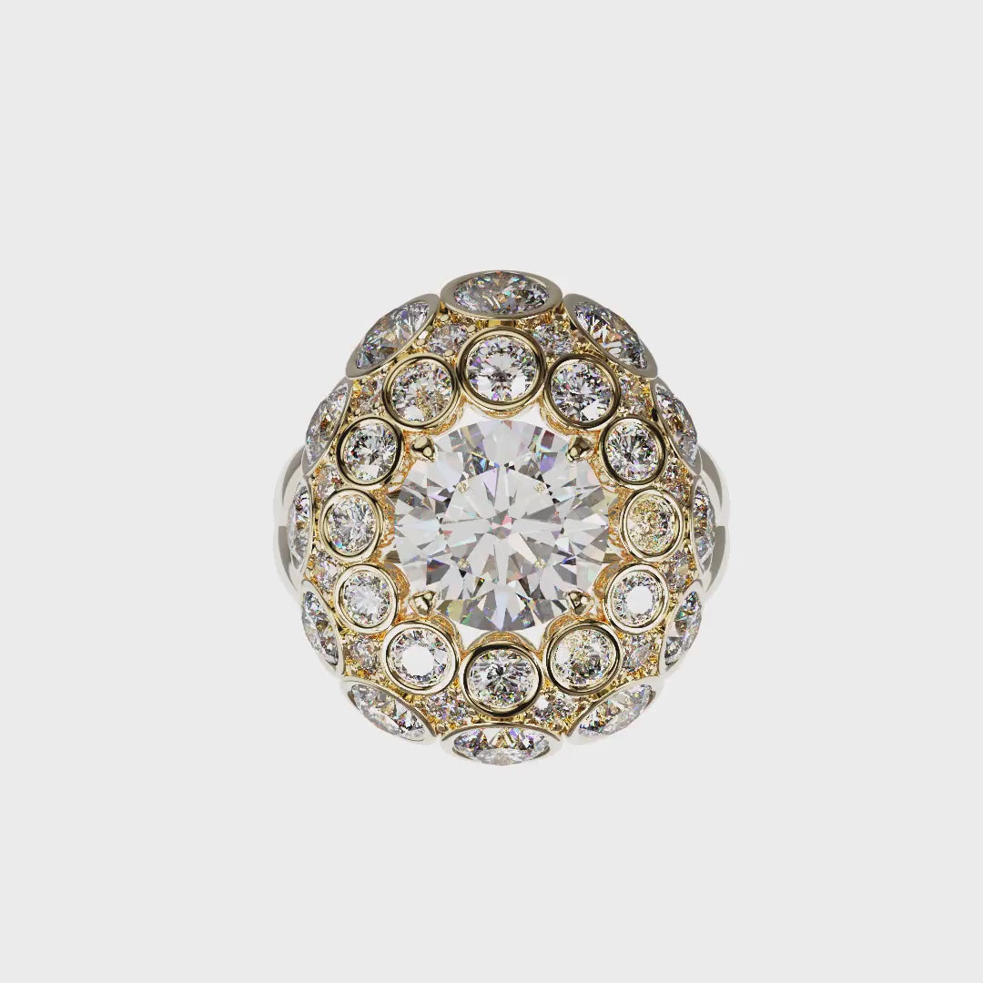 A monumental, egg-shaped dome. At its center, 3.4 carats. Surrounding it, 36 diamonds, totaling 5 carats. An architectural structure that covers the entire fingertip. ÉCLORA captures light from every angle. A boundless, imposing, audacious piece.