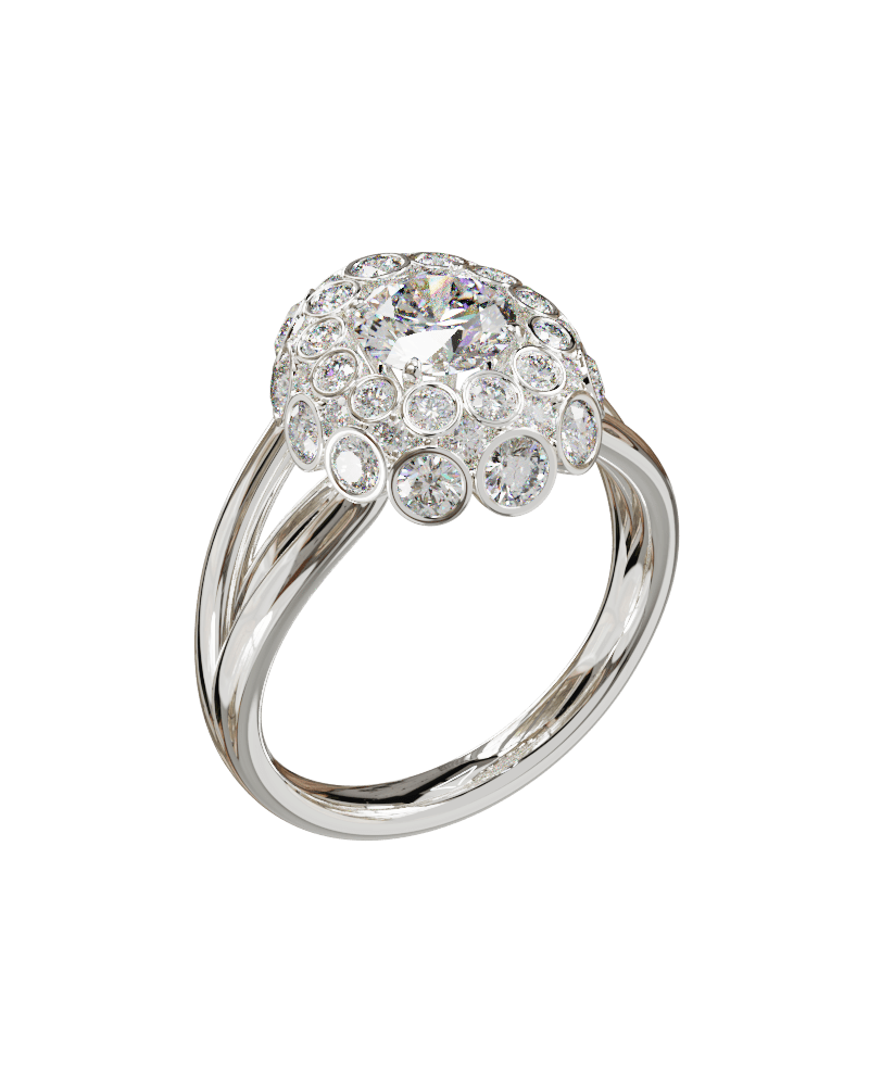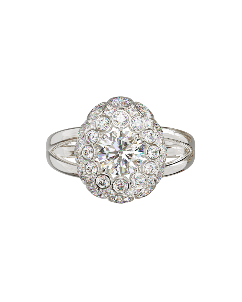 Specifications: 18k gold (750/1000) 8.0g, 1.0ct round synthetic diamond center, D, VS+, 6.50mm diameter, surrounded by 12 round synthetic diamonds of 0.03ct each, for a total of 1.36ct