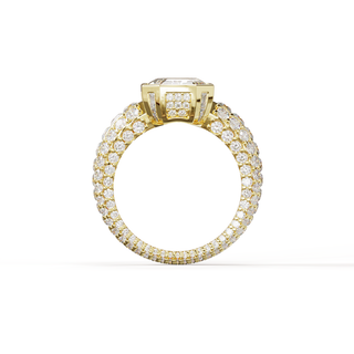 Bague en or jaune 18 carats pavée de diamants, taille brillant et princesse, disposés en dégradé, avec une ouverture sous la pierre pour laisser passer la lumière.