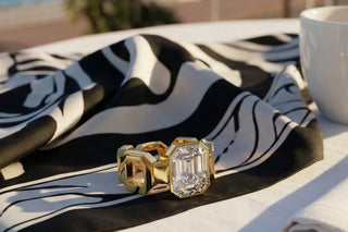 Le corps se compose de bandes parallèles, comme des nervures dorées qui rythment la surface et captent les reflets. Une découpe latérale ajourée laisse apparaître la pierre de profil, révélant sa profondeur et la transparence de sa taille. Chaque ligne, chaque arête, chaque vide participe à l’équilibre de l’ensemble massif, mais d’une précision absolue.