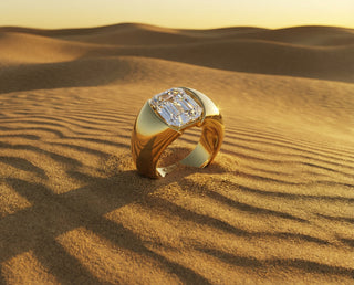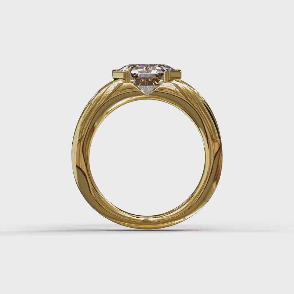 Bague en or jaune au design sculptural et épuré, dont le corps large et bombé enveloppe un diamant taille émeraude.
