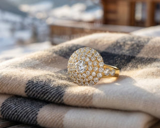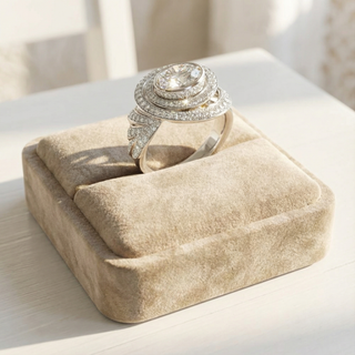 Au centre, une pierre de forme ovale est entourée de rangs successifs de diamants sertis en cercles concentriques. Le corps de bague supporte ces structures par un montage ouvert qui laisse apparaître deux diamants additionnels sur la partie supérieure de l’anneau. L’ensemble forme une architecture circulaire, structurée par des lignes régulières et un sertissage continu. Toutes vos pierres sauf le diamant de centre de votre bague quintet et les 4 petits princesses de votre bague solitaire ont été integré dans le design