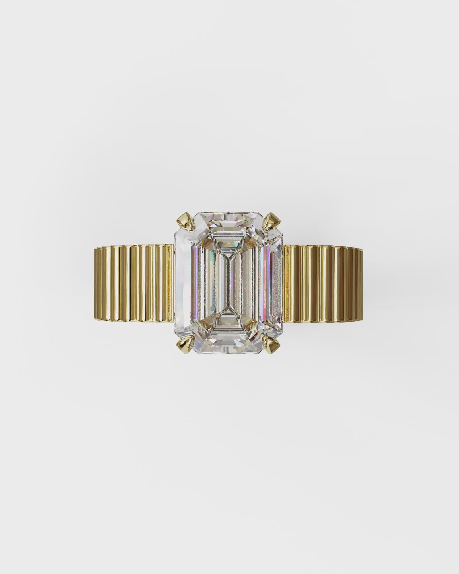 Chaque segment est sculpté dans l’or jaune et parfaitement aligné pour créer une continuité visuelle autour du doigt. La pierre centrale est maintenue par quatre griffes droites, ouvertes pour laisser entrer la lumière sur toute la hauteur de la taille émeraude. Vue de profil, la monture se fond dans la ligne du chaton, soulignant la relation directe entre la géométrie du métal et celle de la pierre.